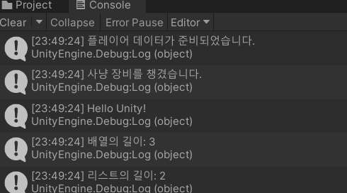 Debug.Log("사냥 장비를 챙겼습니다.");