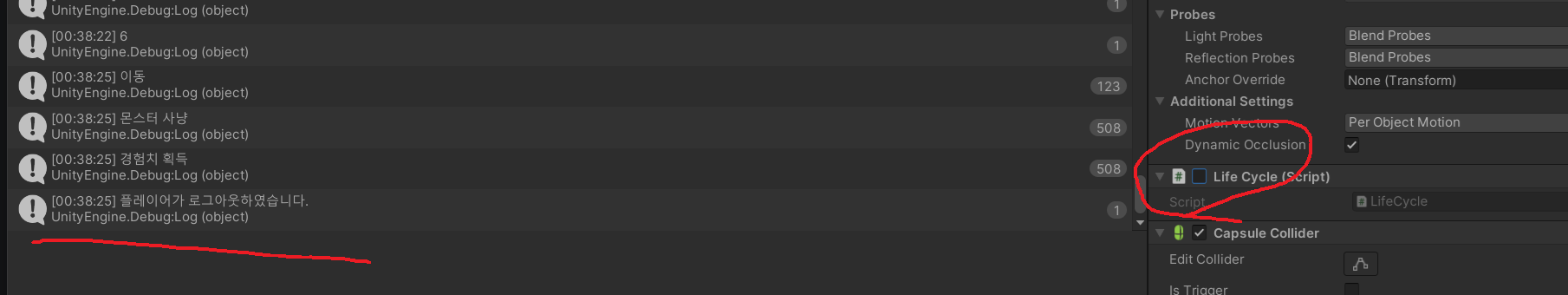 물체에 연결된 스크립트를 해제하면 로그아웃 하였습니다 뜨고
