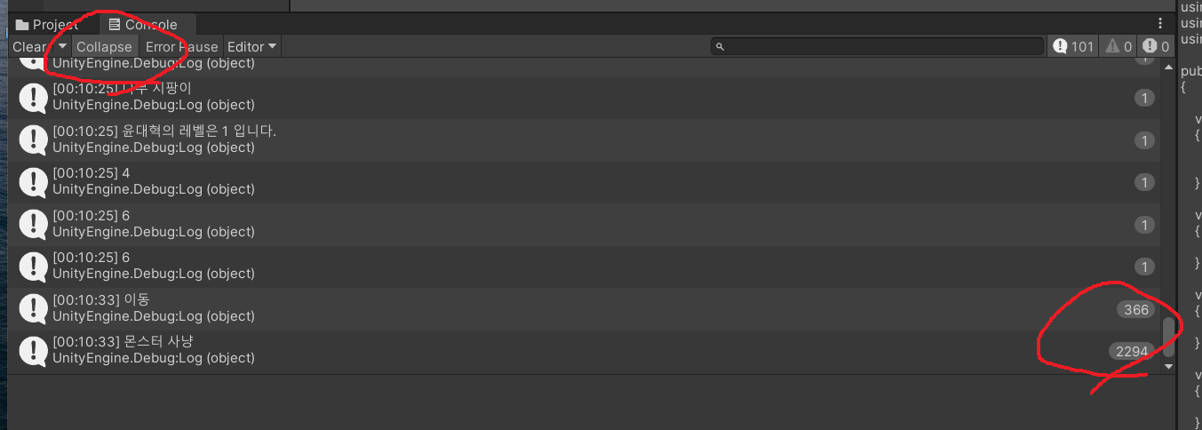 콘솔창 좌측 상단 Collapse 누르면 우측에 출력 횟수로 바꿔주는데