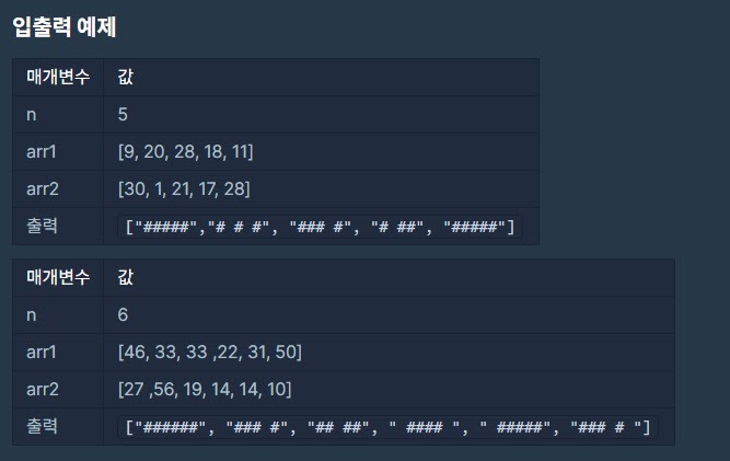 입력으로 지도의 한변 크기 n과 2개의 정수 배열 arr1, arr2가 들어온다.
