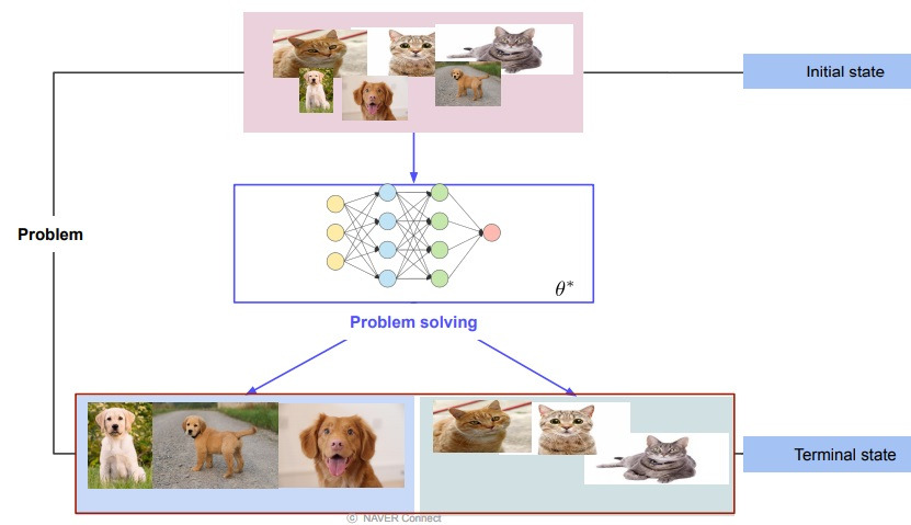 개와 고양이가 뒤섞인 사진이 주어진 상태가 initial state이고 개와 고양이 사진을 완벽하게 분류한 상황이 바라는 terminal state
