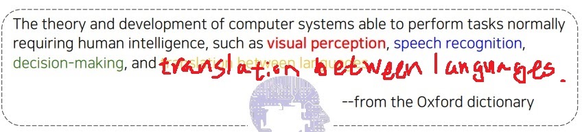 옥스포드에서 정의한 AI는 인간 지능의 범위를 시각 인지능력부터 소리 인지, 사고, 언어간의 번역 등을 포함
