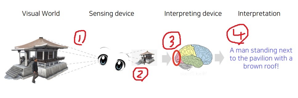 사람이 세상을 바라보면서 수정체에 바라본 물체의 상이 맺히고 그 자극을 뇌에 전달하면 뇌에서 시각정보를 해석