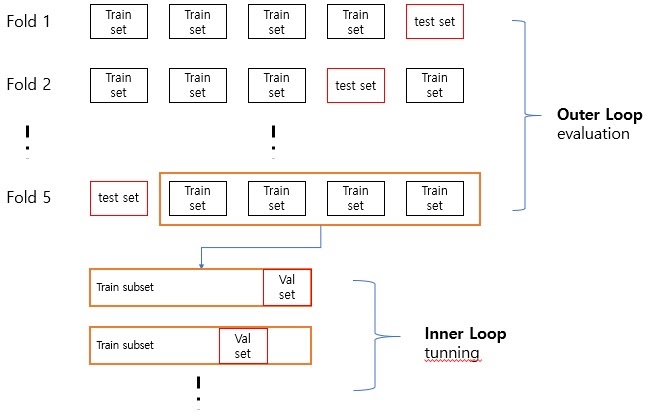 즉 각 fold의 k-1개의 train set을 가지고 각각 k’-fold cross validation을 실시한다. 이것을 inner loop라고 한다.