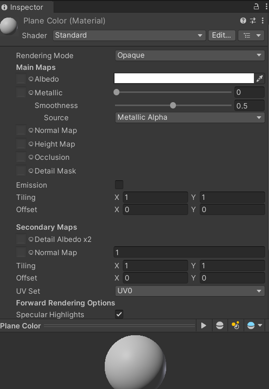 이름을 Plane Color이라고 바꾸고 인스펙터 창을 보면