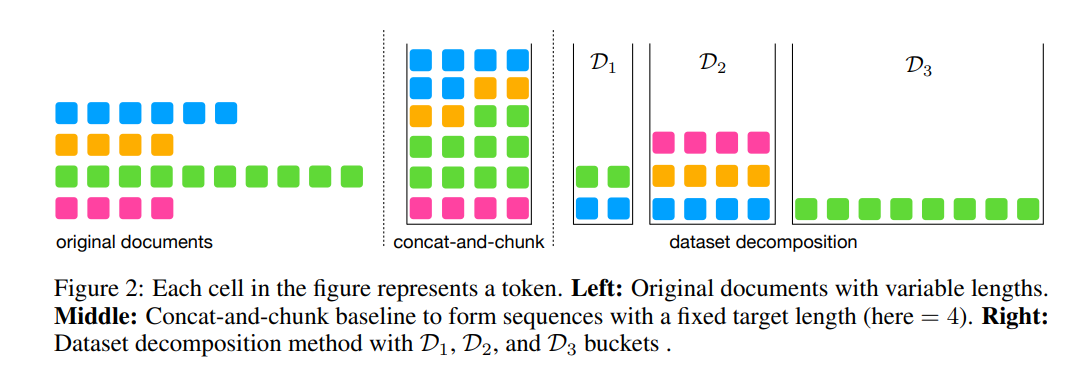 우리는 데이터셋을 고유 문서에서 추출된 동일한 길이의 시퀀스를 포함하는 여러 버킷(bucket)의 합집합으로 분해합니다.