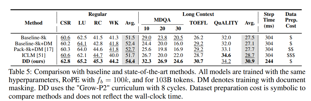 우리는 제안한 방법인 데이터 분해를 문서 마스킹(DM), 최적 맞춤 시퀀스 패킹 [17], 문맥 내 사전 훈련(ICLM) [51] 등 다양한 문서 길이를 처리하는 다른 접근 방법들과 비교합니다.