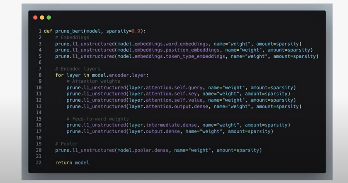 완성된 모델의 레이어 하나하나에 target sparsity에 맞춰 prune 함수를 적용하면 끝