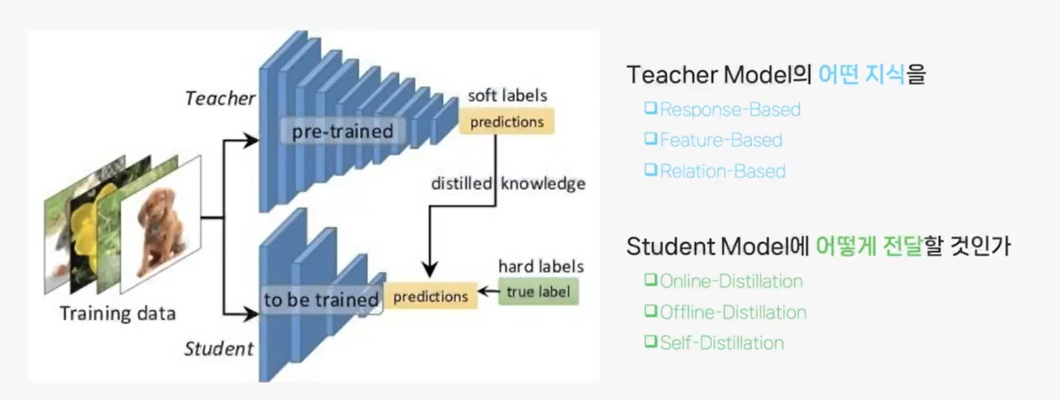 더 크고 더 정밀한 teacher model에서 학습한 가중치를 더 작은 student model에 전이 시키는 것