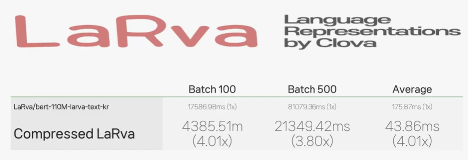 Clova의 LaRva 모델은 1배치당 평균 175.87ms인데 경량화를 통해 4배 더 빠른 43.86ms를 달성했다고함