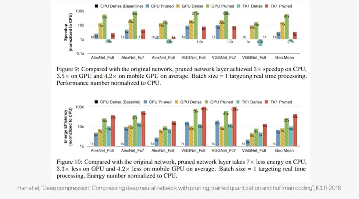 실제로 pruning된 네트워크는 cpu에서 3배정도 빠르고 전력도 7배나 덜 소모