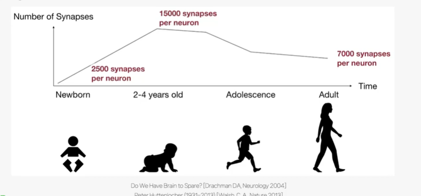 어렸을때 비해 어른일때 시냅스가 반토막 나지만 성인일때 오히려 전문적임