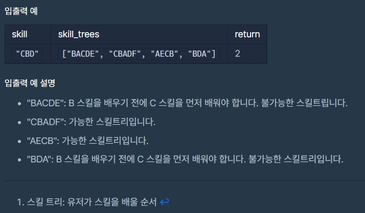 skill_trees의 원소는 길이가 2 이상 26이하인 문자열이며, 스킬이 중복해 주어지지 않습니다.