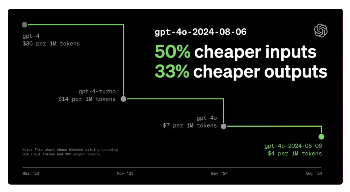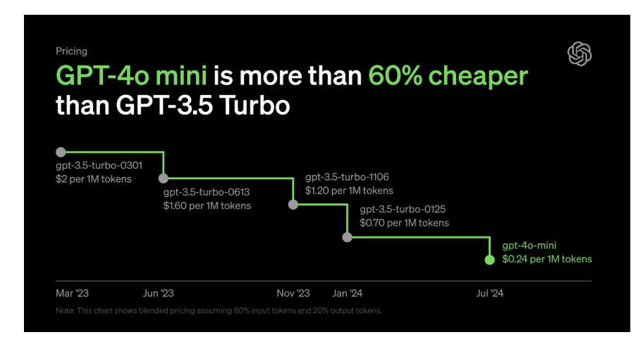 2023.05 gpt 3.5 turbo는 100만 토큰당 2달러였으나 2024.07 gpt 4o mini는 100만 토큰당 0.24달러