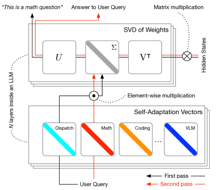 이 프레임워크는 기존 LLM의 정적 구조를 개선하여 특이값 기반 파인튜닝(Singular Value Fine-tuning, SVF) 및 두 단계 추론(Two-pass Inference) 을 결합하여, 더 높은 성능과 효율성을 제공합니다:
