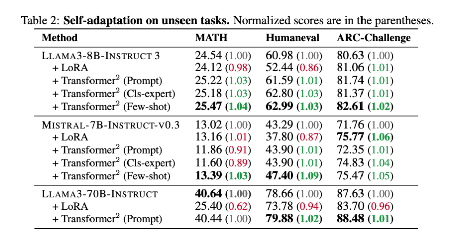 Transformer² 프레임워크는 기존의 LoRA(Low-Rank Adaptation)와 같은 파인튜닝 방식보다 더 적은 매개변수를 사용하며, 계산 효율성을 유지하면서도 성능을 크게 향상시킬 수 있습니다.