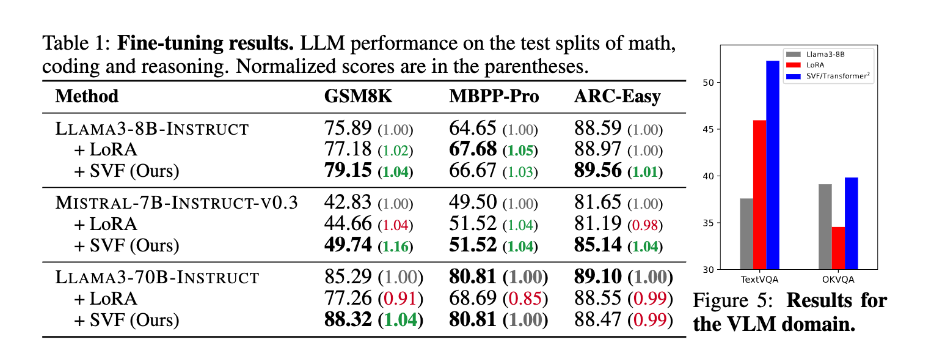 또한, 전체적인 모델의 성능 평가에 있어서도 미세조정 전의 기준점과 LoRA 기법보다 SVF 기법이 더 나은 성능을 보였습니다.