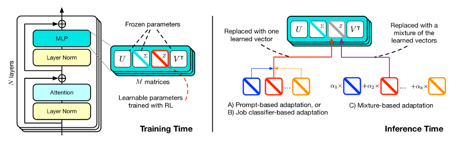 또한, Transformer²는 SVF를 강화학습(Reinforcement Learning, RL)과 결합하여 LLM의 성능을 최적화하는 학습방식을 제안하고 있습니다.