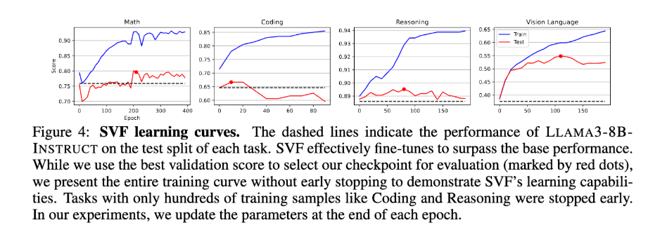 먼저, 다음은 수학(Math), 코딩(Coding), 추론(Reasoning), 시각-언어(Vision-Language)의 4가지 작업에서 특이값 기반 파인튜닝(Singular Value Fine-tuning, SVF) 과정에서 발생하는 학습 곡선을 시각화한 도표로, SVF가 작업별로 얼마나 효과적으로 학습하며, 기존 모델 성능을 얼마나 초과하는지 보여줍니다: