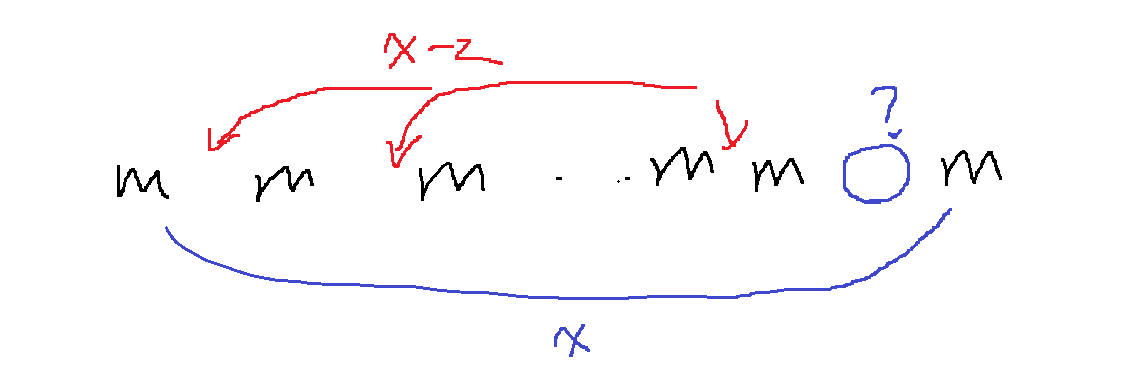 그 사이에 들어가는 n1은 최대 x개 있을 수 있으므로 x-1개를 m 사이에 전부 배치하면 1개 남는데