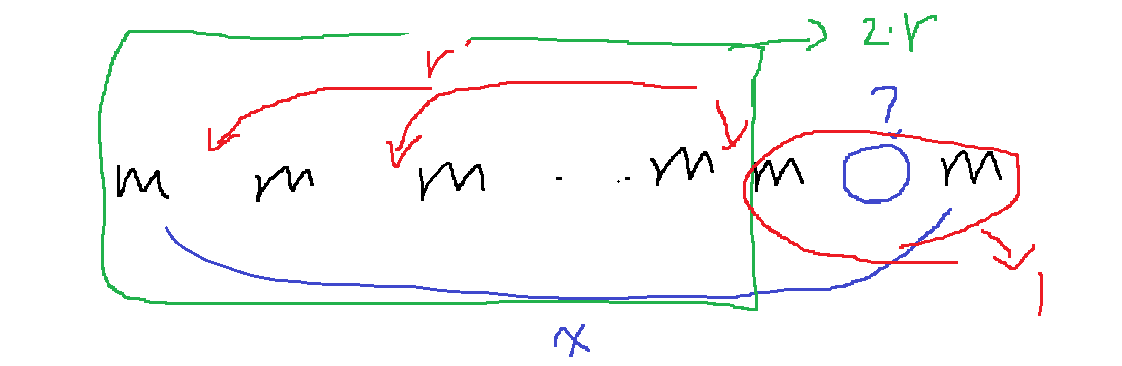 m 사이 공간은 x-1개의 공간이 있는데 r = x-2개이면 x-2개는 채울 수 있는데.. 결국 m 2개가 서로 붙어버리게 된다