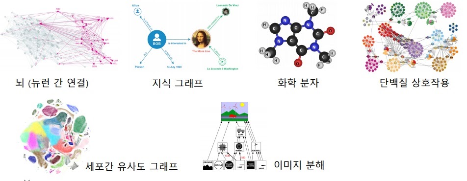 뇌의 뉴런 연결, 지식 그래프, 화학 분자, 단백질의 상호작용 등도 모두 하나의 complex system을 표현하는 graph