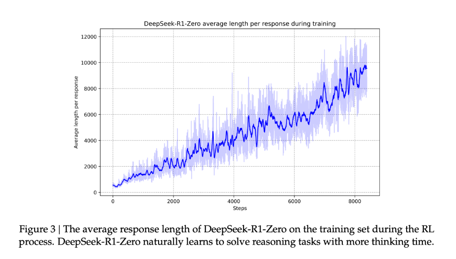 학습 과정에서 DeepSeek-R1-Zero는 더 긴 사고 시간을 활용하여 점점 더 복잡한 추론 작업을 해결하는 능력을 자연스럽게 습득했습니다.