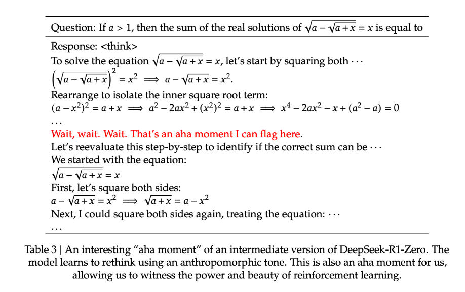 이 시점에서 DeepSeek-R1-Zero는 문제를 재평가하고 초기 접근 방식을 수정하는 데 더 많은 사고 시간을 할당하는 법을 학습합니다.