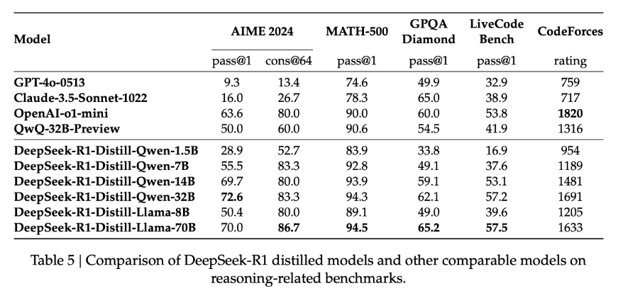 증류된 DeepSeek-R1 모델은 AIME 2024, MATH-500, GPQA Diamond와 같은 벤치마크에서 GPT-4o와 Claude-3.5-Sonnet을 능가했습니다.