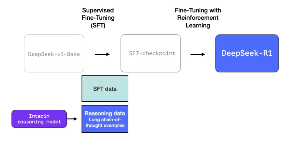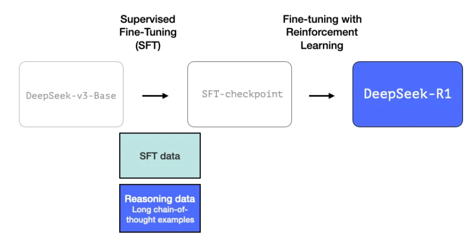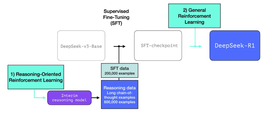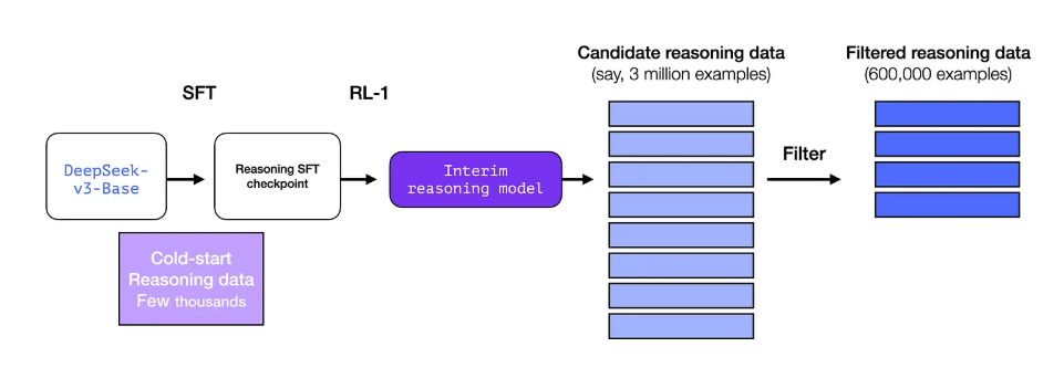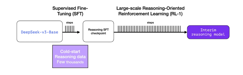 중간 단계 추론 모델을 더 유용하게 만들기 위해, 모델은 수천 개의 추론 문제 예시(일부는 R1-Zero에서 생성되어 필터링된 것)를 기반으로 지도 학습(SFT) 훈련 단계를 거칩니다.