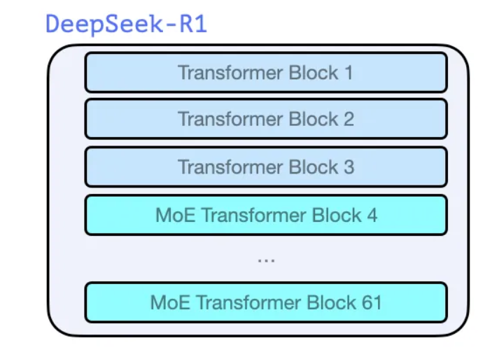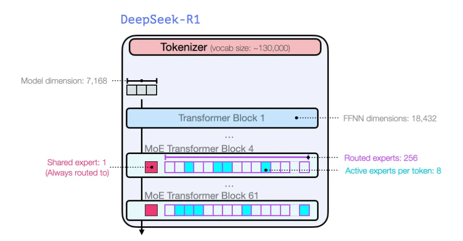 GPT2와 GPT3 초기 모델들과 마찬가지로, DeepSeek-R1은 트랜스포머 디코더 블록의 스택으로 구성됩니다.