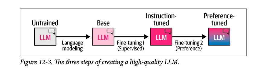 다음 그림은 고품질 LLM을 만드는 일반적인 과정을 세 단계로 보여줍니다.
