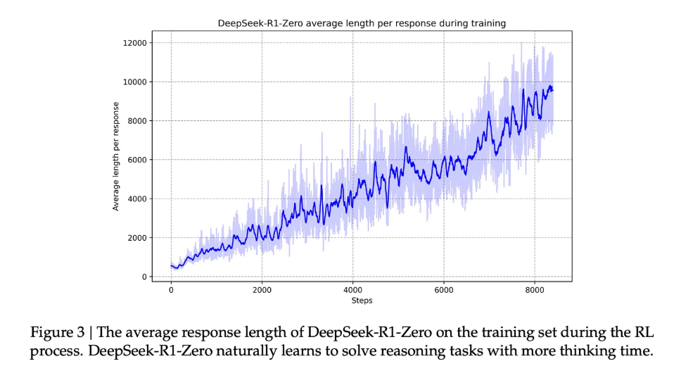이 능력의 향상에 대응하여 생성된 응답의 길이가 길어지며, 모델은 문제를 처리하기 위해 더 많은 사고 토큰을 생성합니다.