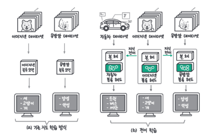 이후 유방암이 양성인지, 악성인지 분류하는 새로운 문제를 풀고자 한다면, 유방암 데이터만으로 학습한 모델보다