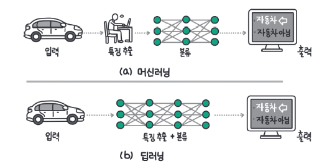 기존 머신러닝은 데이터의 특징을 연구자 또는 개발자가 찾고 모델에 입력으로 넣어 자동차인지 아닌지 결과를 출력