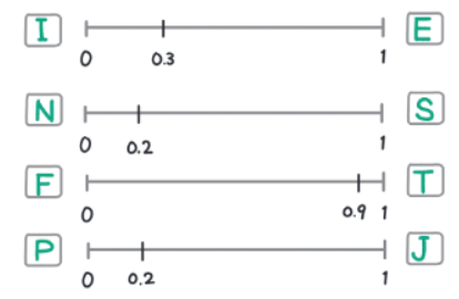 이 사람의 MBTI는 INTP이며, [0.3,0.2,0.9,0.2]로 나타낼 수 있다.