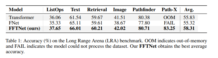 우리의 FFTNet 모델은 대부분의 작업에서 더 높은 정확도를 기록했으며, 특히 ListOps에서 37.65%의 정확도를 달성했습니다(표준 Transformer는 36.06%, FNet은 35.33%의 정확도).