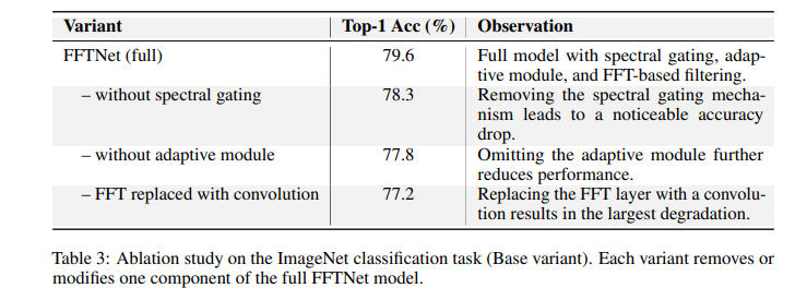 - FFTNet의 주요 구성 요소를 제거할수록 정확도가 감소하는 경향을 보임