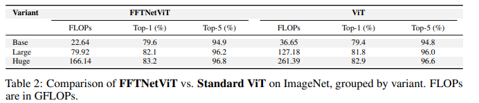 특히, FFTNetViT는 비슷한 모델 크기에서 ViT보다 낮은 FLOPs를 달성하면서도 강력한 정확도를 유지하는 경우가 많습니다.