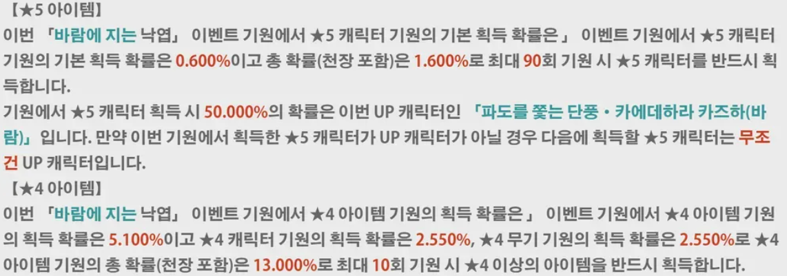 "5성 캐릭터 기원의 기본 획득 확률은 0.600%이고, 총 확률(천장 포함)은 1.600%로~"