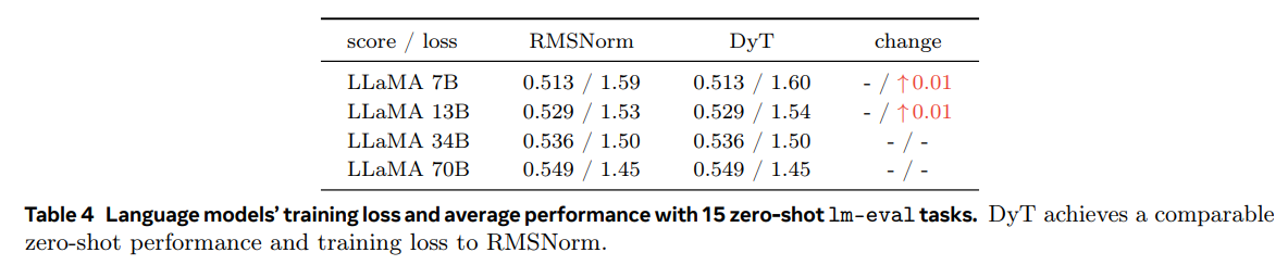 - LLaMA 모델에서 DyT는 기존 RMSNorm보다 훈련 속도를 8% 개선.