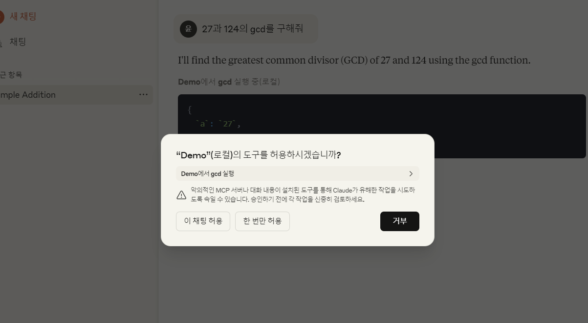 Claude가 MCP를 쓸지 말지 경고창이 뜬다