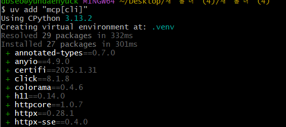 이후 uv add "mcp[cli]"로 하면 .venv라는 가상환경에 설치가 되는 것을 확인할 수 있다