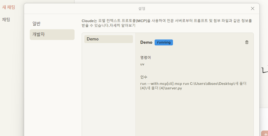 mcp install server.py하면 Demo라는 서버가 claude에 설치된다는 것을 확인