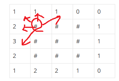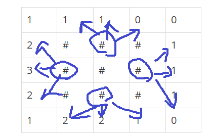 첫번째 #은 바로 위에 1이 쓰여있고, 우측 대각선 상단에 1이 쓰여있으므로 지뢰가 있을 수 있다.