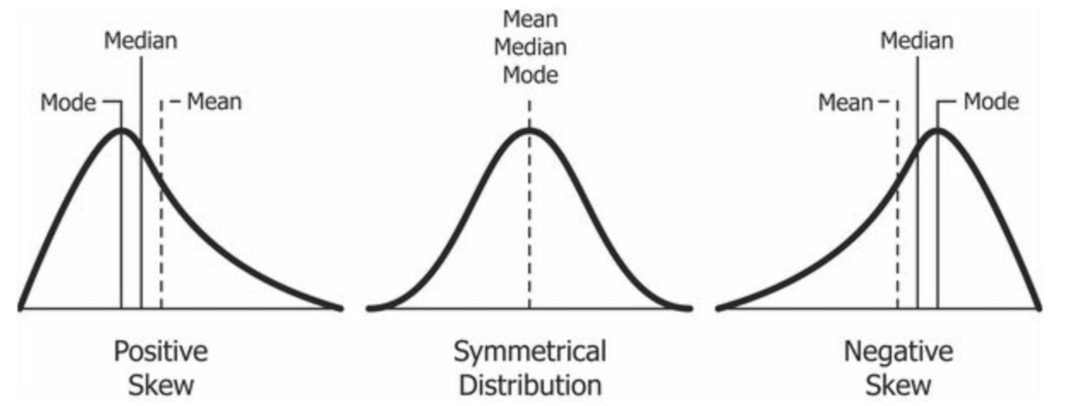 일반적으로 왜도가 양수면 왼쪽 그림처럼 최빈값 < 중앙값 < 평균