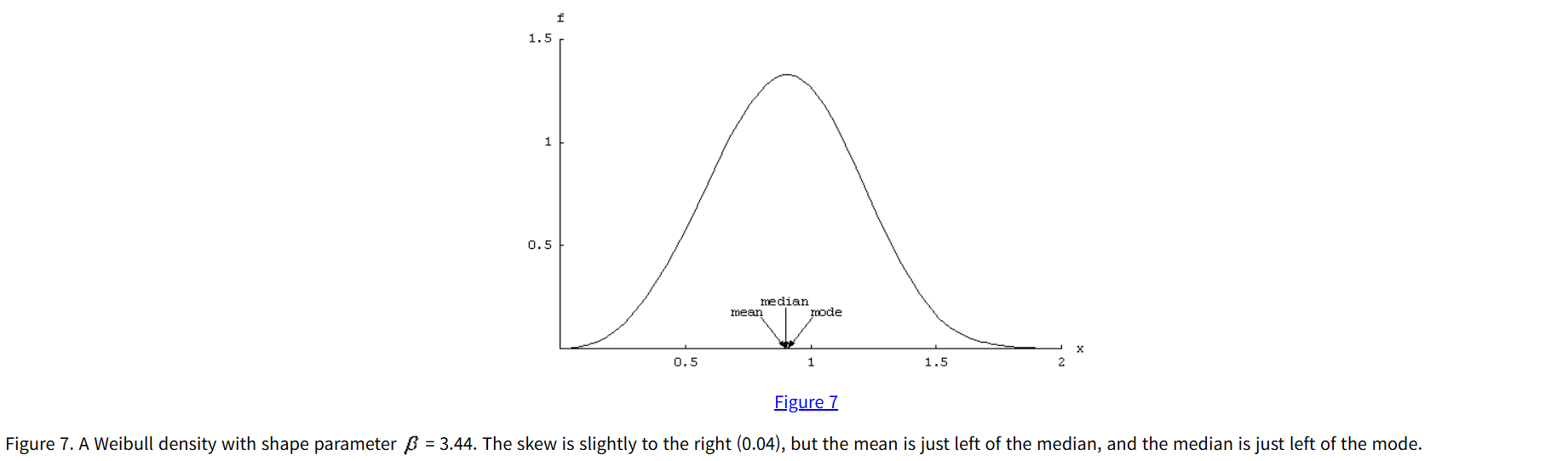 다음과 같은 웨이불 분포분 왜도가 양수지만 중앙값의 왼쪽에 평균이 있다