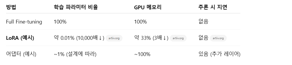 이러한 장점 덕분에 LoRA는 파라미터 효율적 파인튜닝(PEFT, Parameter-Efficient Fine-Tuning) 기법의 대표주자로 자리매김했습니다.