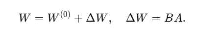 즉, 두 작은 행렬 $A \in \mathbb{R}^{r \times d_2}$, $B \in \mathbb{R}^{d_1 \times r}$를 학습하여 다음과 같이 재파라미터화합니다: