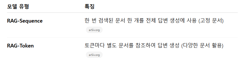 RAG-Sequence는 하나의 검색된 문서를 선택하여 전체 답변을 만드는 반면, RAG-Token은 각 출력 토큰마다 다른 문서를 참조하며 답변을 생성합니다ar5iv.orgar5iv.org.